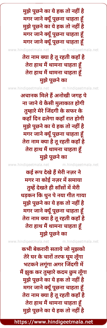 Lyrics of Mujhe Puchhne Ka Ye Haq To Nahi Hai (Male) - मुझे पूछने का ये हक तो नहीं है