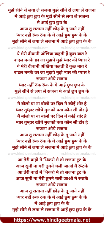 Lyrics of Mujhe Sine Se Lagaale Sajna - मुझे सीने से लगा ले सजना मुझे सीने से लगा ले सजना