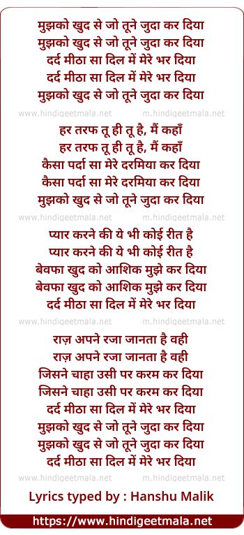 Lyrics of Mujhko Khud Se Jo Tune Juda Kar Diya - मुझको खुद से जो तूने जुदा कर दिया