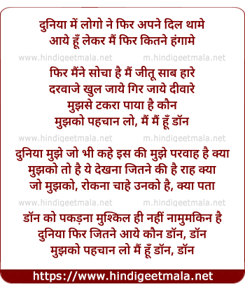 Lyrics of Mujhko Pehchaan Lo Main Hoon Don - मुझको पहचान लो मैं हूँ डॉन