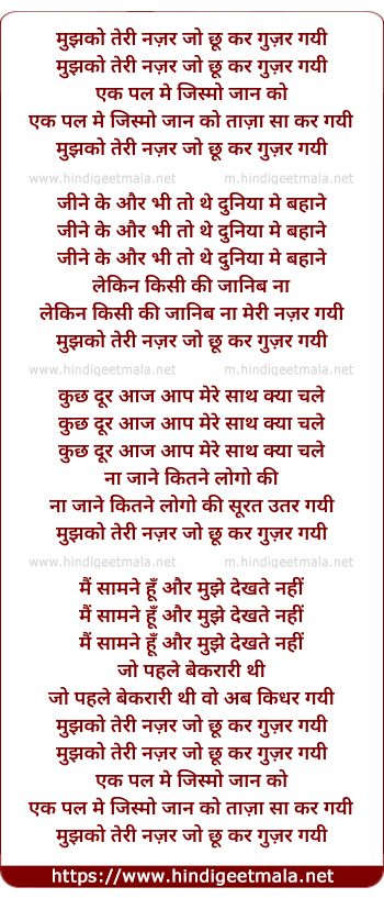 Lyrics of Mujhko Teri Nazar - मुझको तेरी नज़र जो छू कर गुज़र गयी