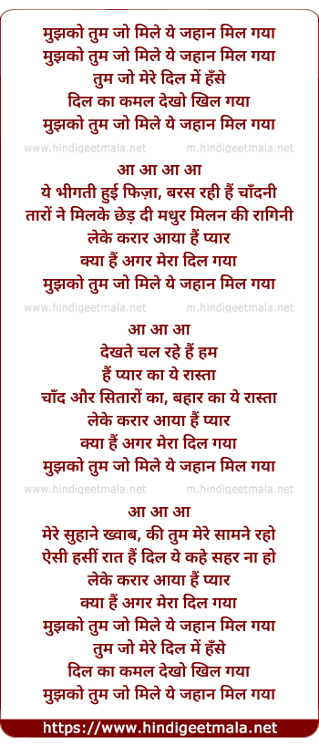 Lyrics of Mujhko Tum Jo Mile Yeh Jahan Mil Gaya (Duet) - मुझको तुम जो मिले ये जहान मिल गया