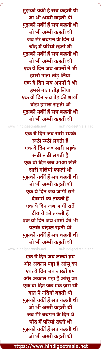 Lyrics of Mujhko Yakin Hai - मुझको यकीं हैं सच कहती थी