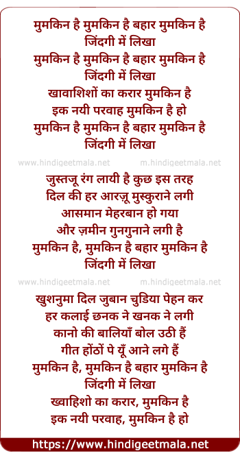 Lyrics of Mumkin Hai Bahar Mumkinn Hai - मुमकिन है बहार मुमकिन है