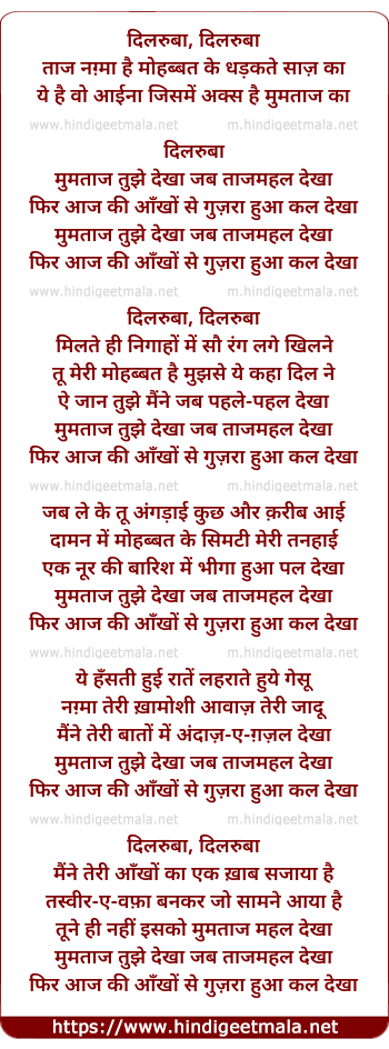 Lyrics of Mumtaaj Tujhe Dekhaa Jab Tajmahal Dekha - मुमताज तुझे देखा जब ताजमहल देखा