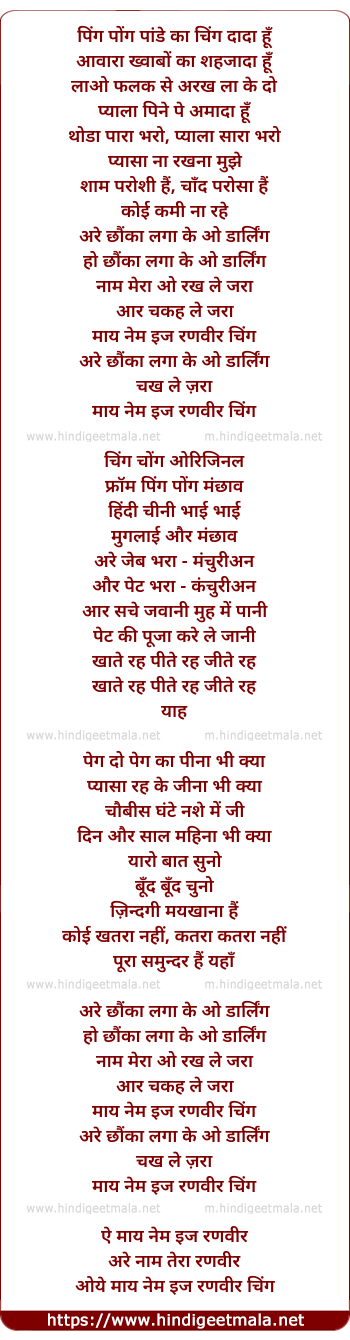 Lyrics of My Name Is Ranveer Ching - पिंग पोंग पांडे का चिंग दादा हूँ