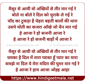 Lyrics of Mysore Se Aayi - मैसूर से आयी वो अंखियों से तीर मार गई रे