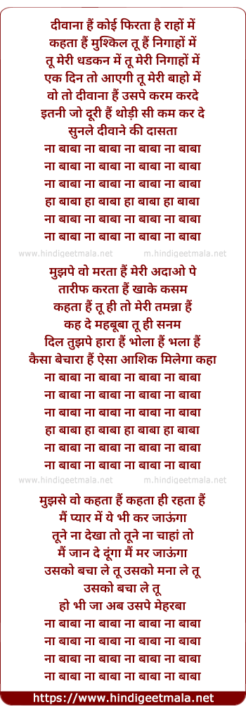 Lyrics of Diwana Hai Koi Firta Hai Raho Me (Na Baba Na Baba) - दीवाना हैं कोई फिरता है राहों में