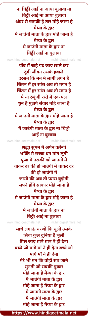 Lyrics of Na Chhithi Aayi Ma Aaya Bulawa - ना चिठ्ठी आई ना आया बुलावा
