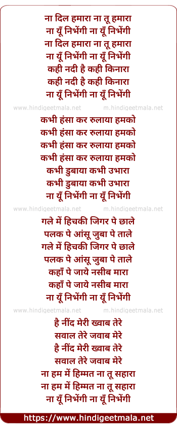 Lyrics of Na Dil Hamara Na Tu Hamara - ना दिल हमारा ना तू हमारा