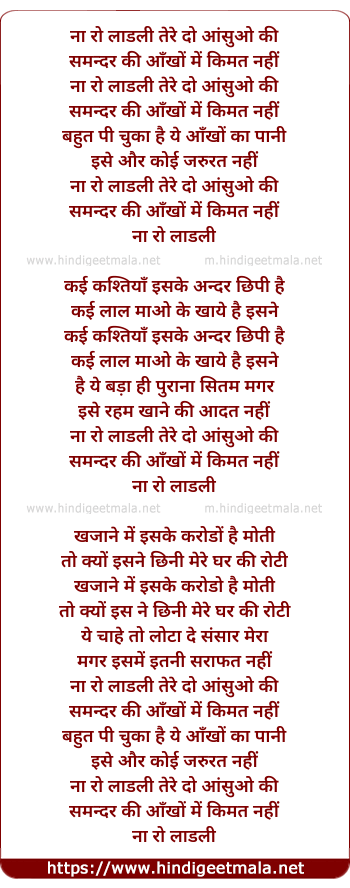 Lyrics of Na Ro Ladli Tere Do Aansuo Ki - ना रो लाडली तेरे दो आंसुओ की