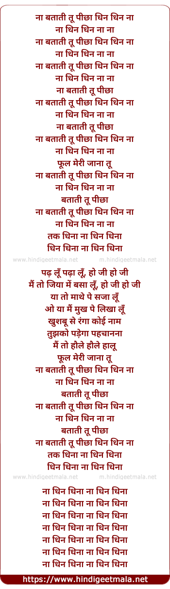 Lyrics of Naa Bataati Tu (Na Dhin Dhin Dhin Na) - ना बताती तू पीछा धिन धिन ना