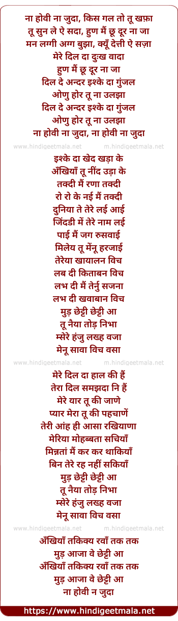 Lyrics of Naa Hoi Na Juda - ना होवी ना जुदा, किस गल तो तू खफ़ा