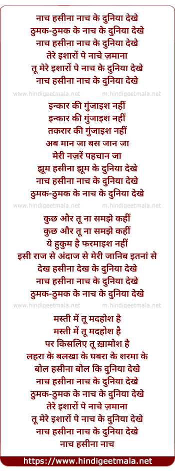 Lyrics of Naach Hasina Naach Ke Duniya Dekhe - नाच हसीना नाच के दुनिया देखे