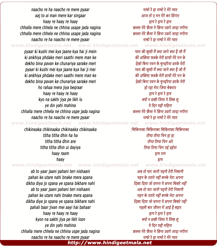 Lyrics of Naacho Re... Chhalla Mere Chhaila Ne Chhina - नाचो रे ...छल्ला मेरे छैला ने छिना