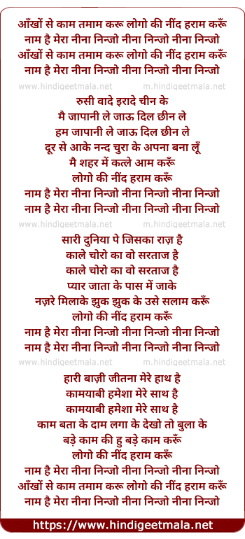 Lyrics of Naam Hai Mera Nina Ninjo - नाम है मेरा नीना निन्जो