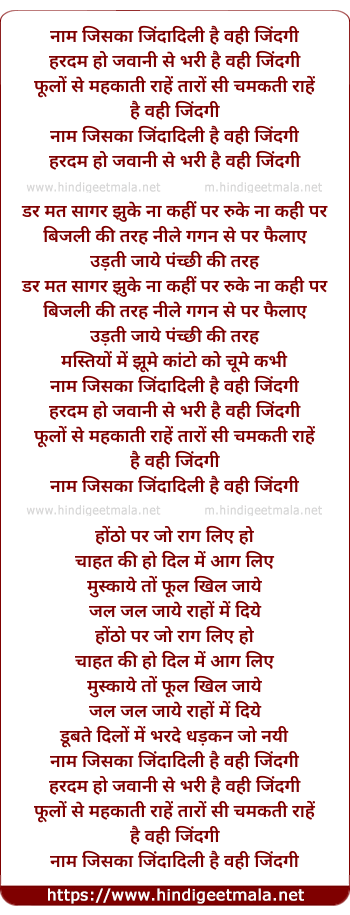 Lyrics of Naam Jiska Zinda Dili Hai Wahi Zindagi - नाम जिसका जिंदा दिली है वही जिंदगी