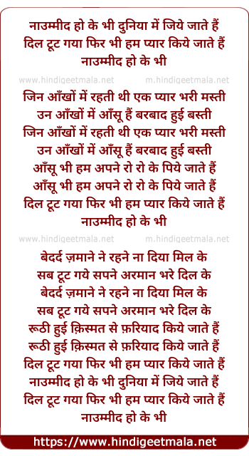 Lyrics of Naaummid Ho Ke Bhi Duniyaa Me Jiye Jaate Hai - नाउम्मीद हो के भी दुनिया में जिये जाते हैं