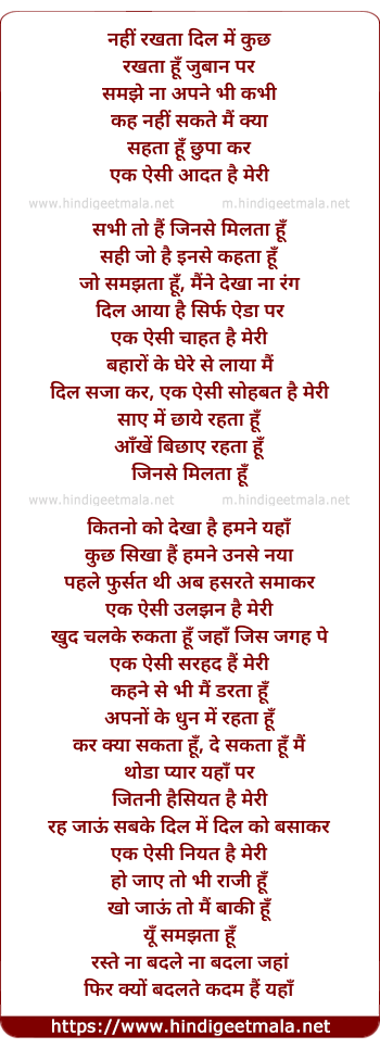 Lyrics of Nahi Rakhta Dil Me Kuch - नहीं रखता दिल में कुछ