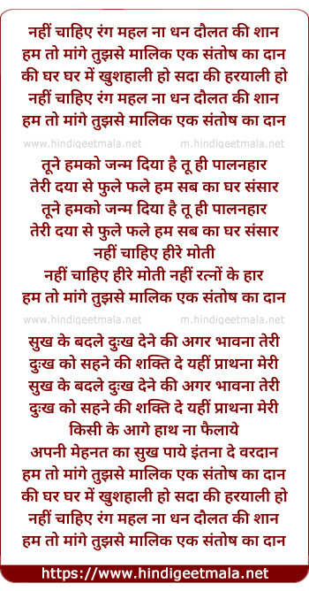 Lyrics of Nahin Chahiye Rang Mahal - I - नहीं चाहिए रंग महल