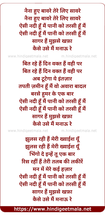 Lyrics of Naina Hue Banwre Tere Liye Sawre - नैना हुए बावरे तेरे लिए सावरे