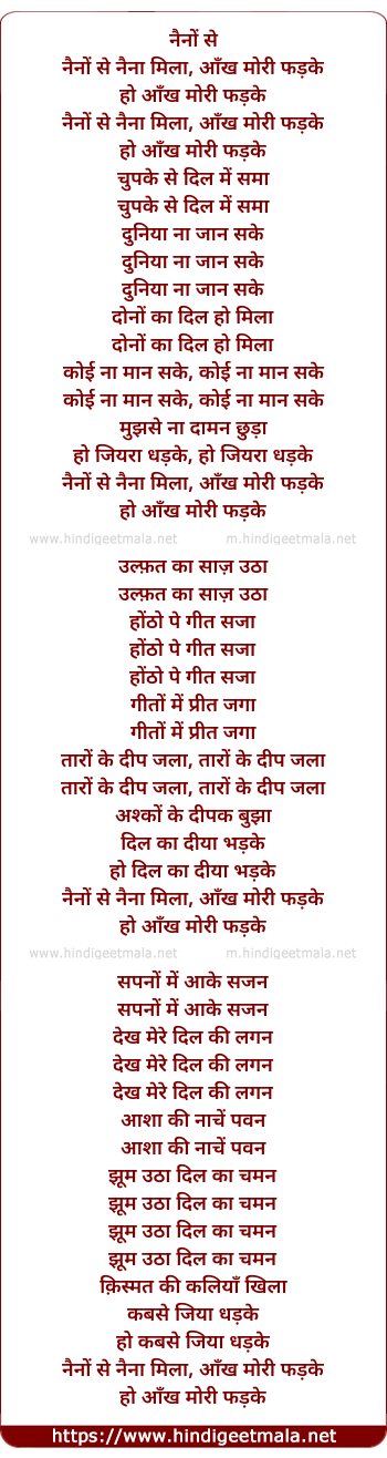 Lyrics of Naino Se Nain Mila Ankh Mori Fadki - नैनों से नैन मिला आंख मोरी फड़की