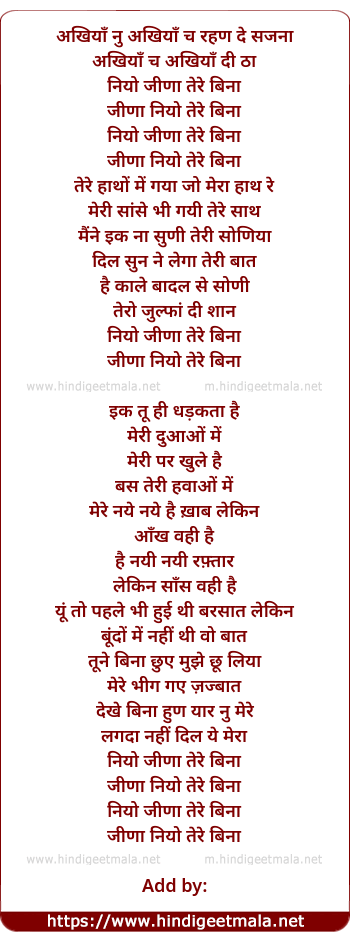 Lyrics of Naio Jeena Tere Bina - नियो जीणा तेरे बिना