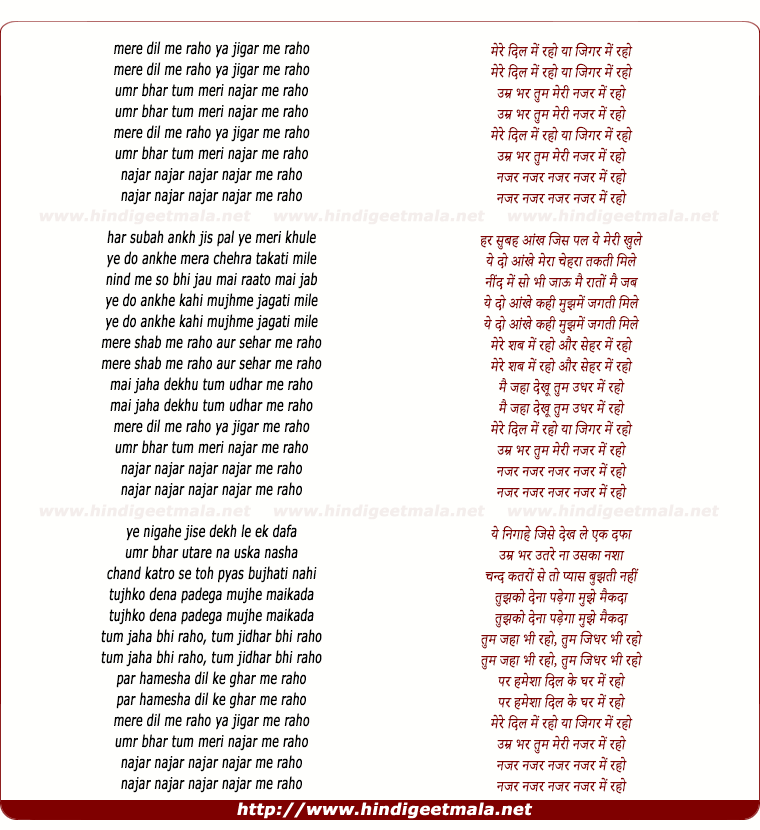 Lyrics of Mere Dil Me Raho Ya Jigar Me Raho - मेरे दिल में रहो या जिगर में रहो