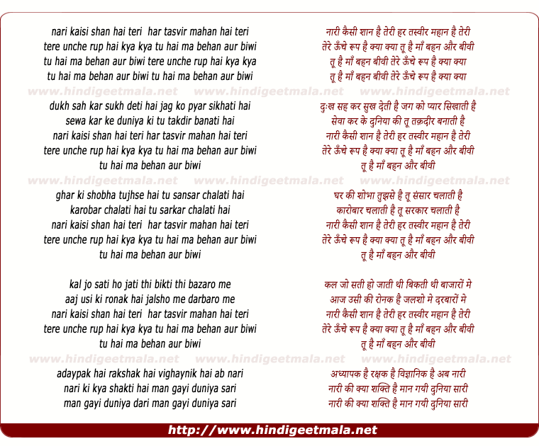 Lyrics of Nari Kaisi Shan Hai Teri Har Tasvir Mahan Hai Teri - नारी कैसी शान है तेरी हर तस्वीर महान है तेरी
