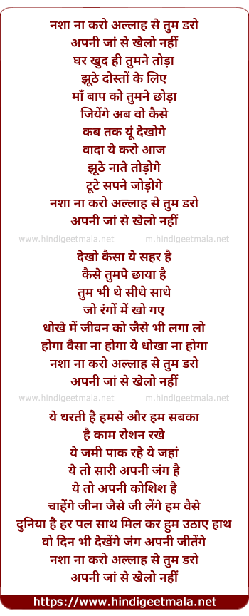 Lyrics of Nasha (Nazia Hassan) - नशा ना करो अल्लाह से तुम डरो