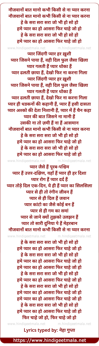 Lyrics of Naujavaano Baat Maano, He Ke Saraa Saraa Saraa - नौजवानों बात मानो, हे के सरा सरा सरा