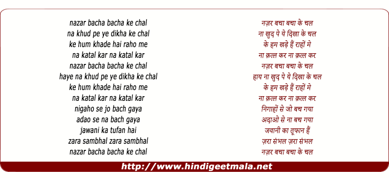 Lyrics of Nazar Bacha Bacha Ke Chal - नज़र बचा बचा के चल