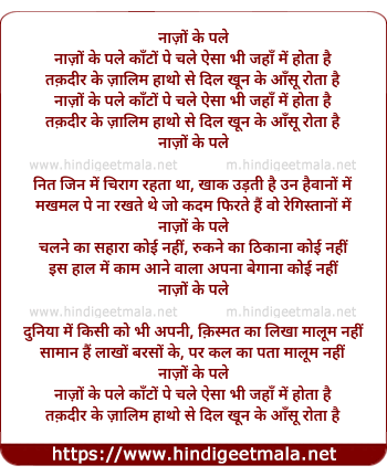 Lyrics of Nazon Ke Pale, Kaanto Pe Chale - नाज़ों के पले, काँटों पे चले