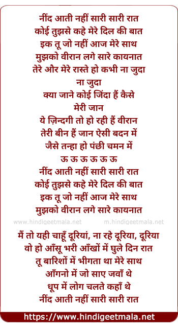 Lyrics of Neend Aati Nahi - नींद आती नहीं सारी सारी रात