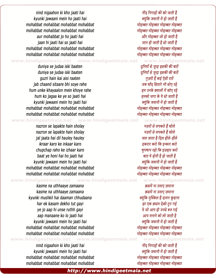 Lyrics of Neend Nighao Ki Kho Jati Hai, Kyunki Jawani Me Ho Jati Hai Mohabbat - नींद निगाहों की खो जाती है, क्यूँकी जवानी में हो जाती है मोहब्बत