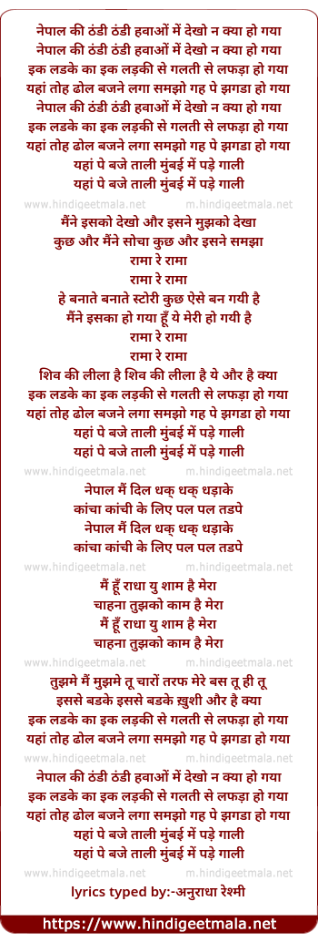 Lyrics of Nepaal Ki Thandi Thandi Hawaao Mein - नेपाल की ठंडी ठंडी हवाओं में