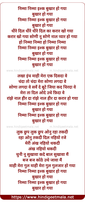 Lyrics of Nimma Nimma Ishq Bukhar - निम्मा निम्मा इश्क बुखार हो गया