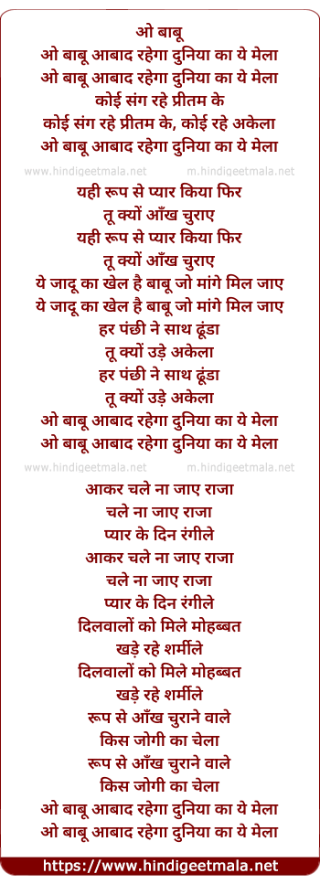 Lyrics of O Babu Aabad Rahega Duniya Ka Ye Mela - ओ बाबू