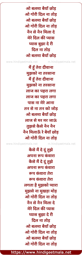 Lyrics of O Balma Baiyan Chhod - ओ बलमा बैयाँ छोड़