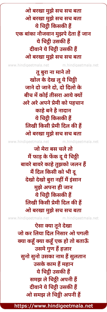 Lyrics of O Barkha Mujhe Sach Sach Bata - ओ बरखा मुझे सच सच बता