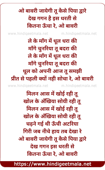 Lyrics of O Bawari Jayegi Tu Kaise Piya Dware - ओ बावरी जायेगी तू कैसे पिया द्वारे