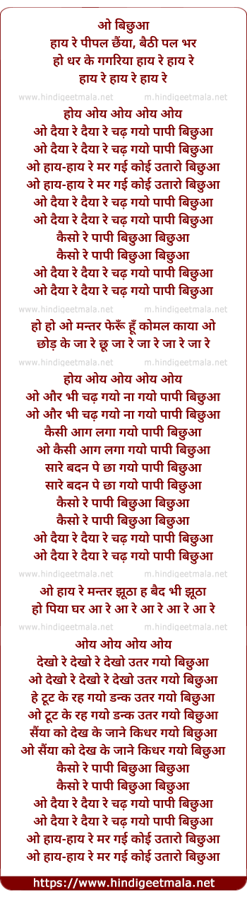 Lyrics of O Bichhua, Dayya Re Dayya Re Chadh Gayo Papi Bichhua - ओ बिछुआ, दैया रे दैया रे चढ़ गयो पापी बिछुआ