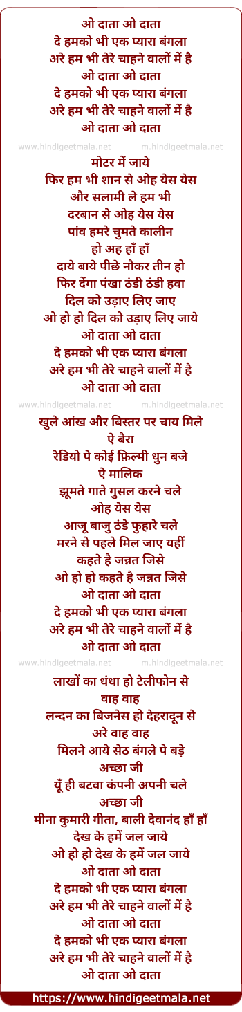Lyrics of O Data De Hamko Bhi Ek Pyara Bangala - ओ दाता दे हमको भी एक प्यारा बंगला
