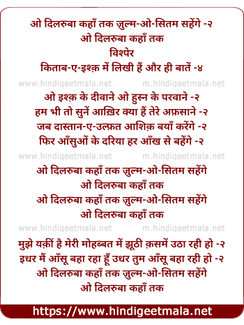 Lyrics of O Dilaruba Kaha Tak Zulm O Sitam Sahenge - ओ दिलरुबा कहाँ तक ज़ुल्म ओ सितम सहेंगे