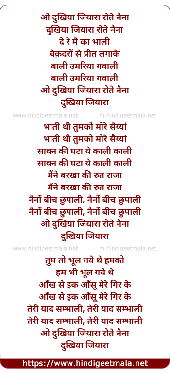 Lyrics of O Dukhiya Jiyara Rote Naina - ओ दुखिया जियारा रोते नैना