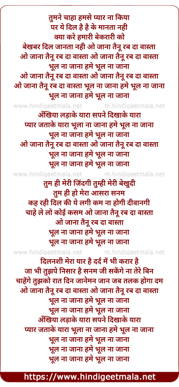 Lyrics of O Jaana Tenu Rab Da Wasta - ओ जाना तैनू रब दा वास्ता