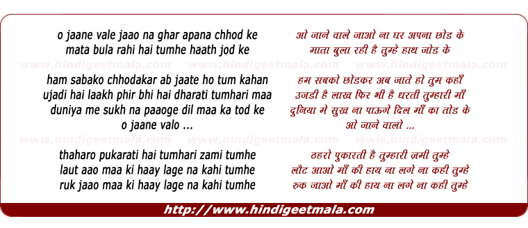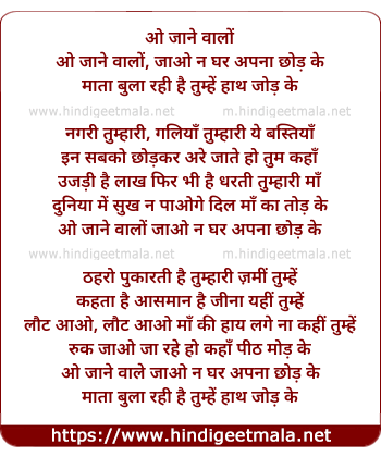 Lyrics of O Jaane Vaalo Jaao Na Ghar Apna Chhod Ke - ओ जाने वाले जाओ ना घर अपना छोड़ के