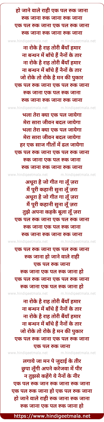 Lyrics of O Jaanevale Raahi Ik Pal Ruk Jaanaa - ओ जानेवाले राही एक पल रुक जाना
