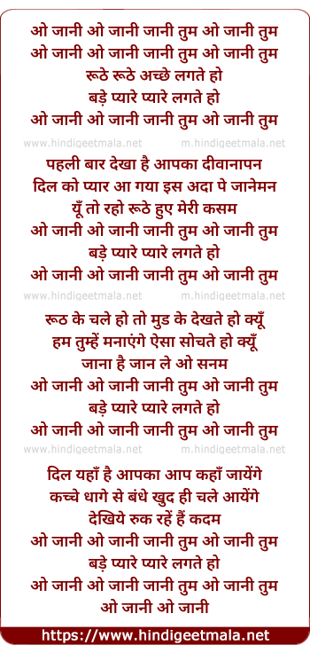 Lyrics of O Jaani Jaanii, Tum Roothe Roothe - ओ जानी जानी, तुम रूठे रूठे