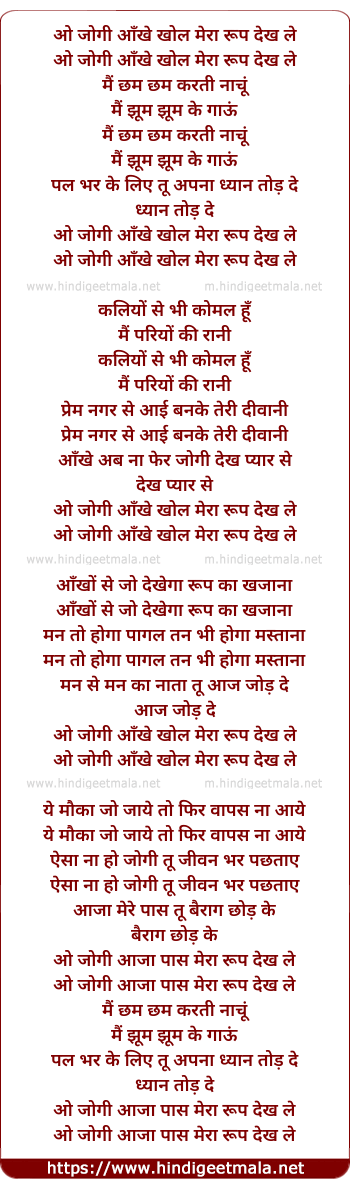 Lyrics of O Jogi Aankhen Khol Mera Roop Dekh Le - ओ जोगी आँखे खोल मेरा रूप देख ले